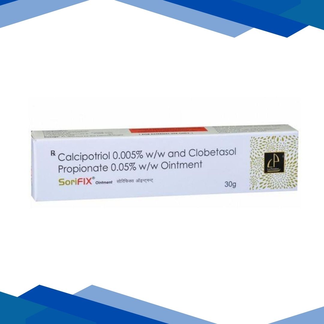 SORIFIX OINTMENT is a combination of Calcipotriol and Clobetasol which belongs to the group of medicines called Topical Corticosteroids. It is indicated for the topical management of plaque psoriasis. Plaque psoriasis (psoriasis vulgaris) is an autoimmune disease that causes cells to reproduce very quickly which causes thick, scaly patches called plaques on the skin.