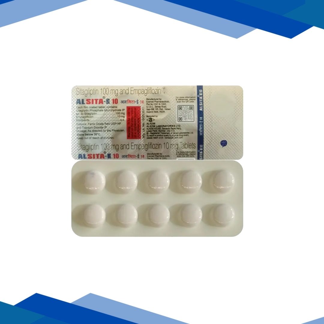 Alsita E 10 Tablet (strip of 10) is a dual-action antidiabetic medicine used in type 2 diabetes to reduce blood sugar by helping the kidneys remove glucose and improving insulin response. For more details kindly click on Medicine Salts below: