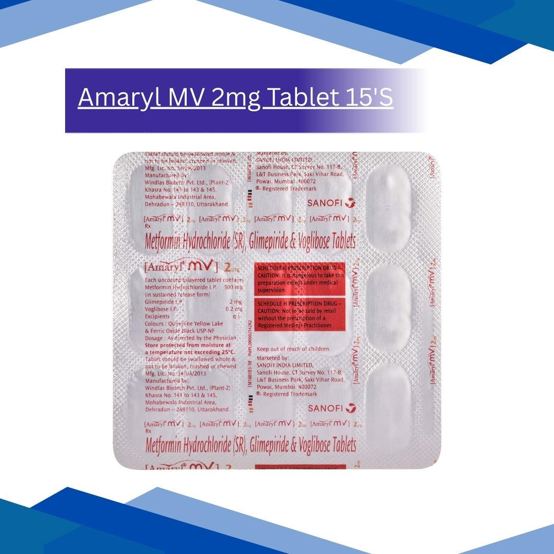 Amaryl MV 2 mg Tablet 15’S is an anti‑diabetic medicine used to manage Type 2 Diabetes Mellitus by controlling blood sugar levels. It works via three mechanisms — increasing insulin release, reducing glucose production, and slowing carbohydrate absorption. For more details kindly click on Medicine Salts below: