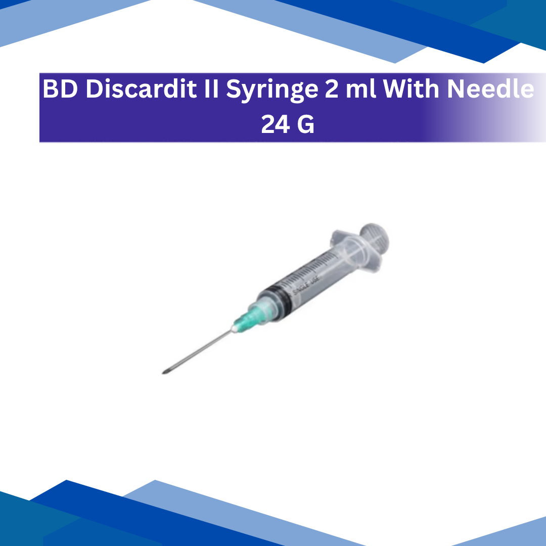 The BD Discardit II Syringe 2 ml with Needle 24G is a single-use, sterile medical device designed for precise fluid administration. It features a 24-gauge, 1-inch needle, ensuring minimal discomfort during injections. The syringe is made from high-quality medical-grade plastic, ensuring durability and reliability.