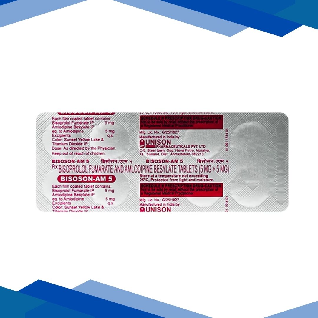 BISOSON AM 5 Tablet 10’s is a combination cardiovascular medicine used to manage high blood pressure (hypertension) and reduce the risk of chest pain (angina) by relaxing blood vessels and slowing the heart rate, which helps improve blood flow and lower blood pressure. For more details kindly click on Medicine Salts below: