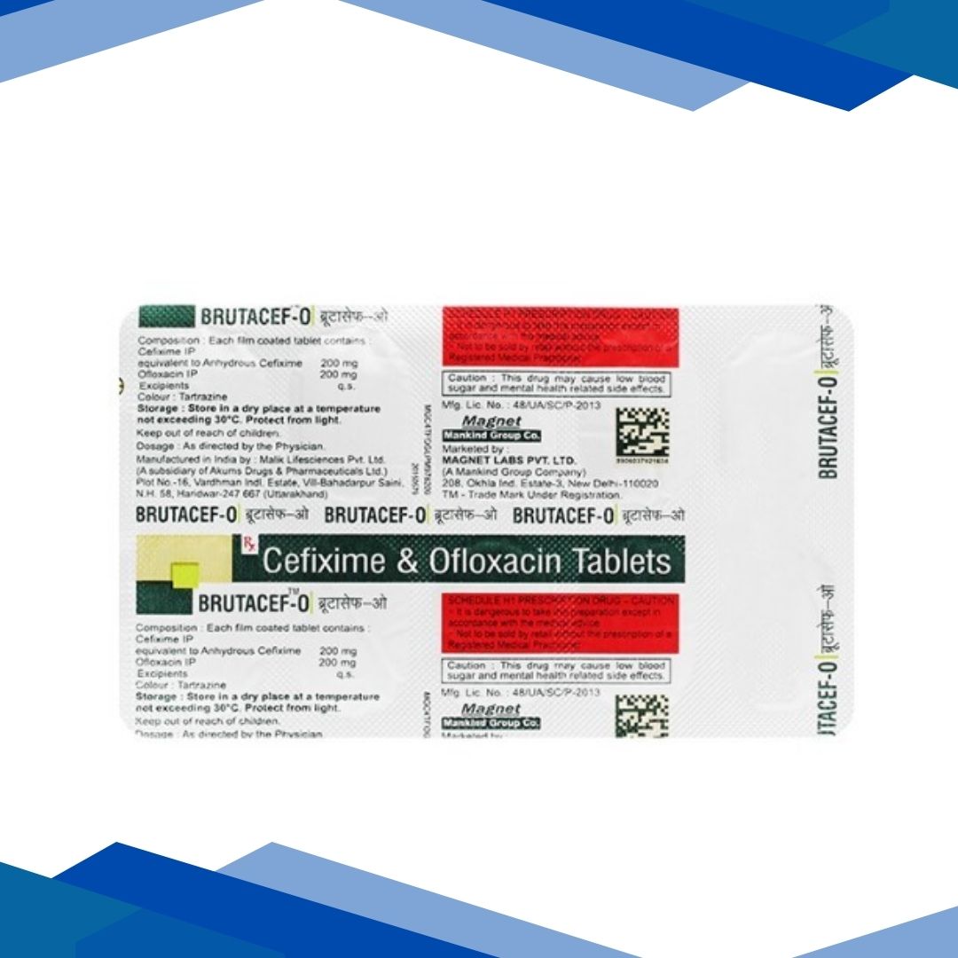 BRUTACEF O 200MG TABLET is a combination of Cefixime and ofloxacin, which belongs to the group of medicines called Antibiotics. It is used in adults to manage typhoid fever (an infection caused by Salmonella typhi, accompanied by high fever, stomach pain, headache, and diarrhea).