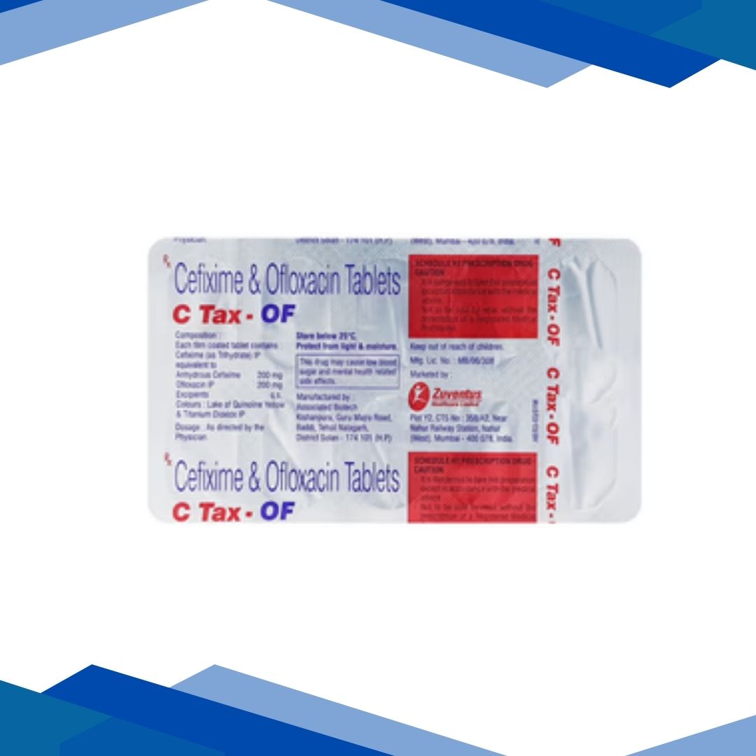 C TAX OF TABLET is a combination of Cefixime and ofloxacin, which belongs to the group of medicines called Antibiotics. It is used in adults to manage typhoid fever (an infection caused by Salmonella typhi, accompanied by high fever, stomach pain, headache, and diarrhea).