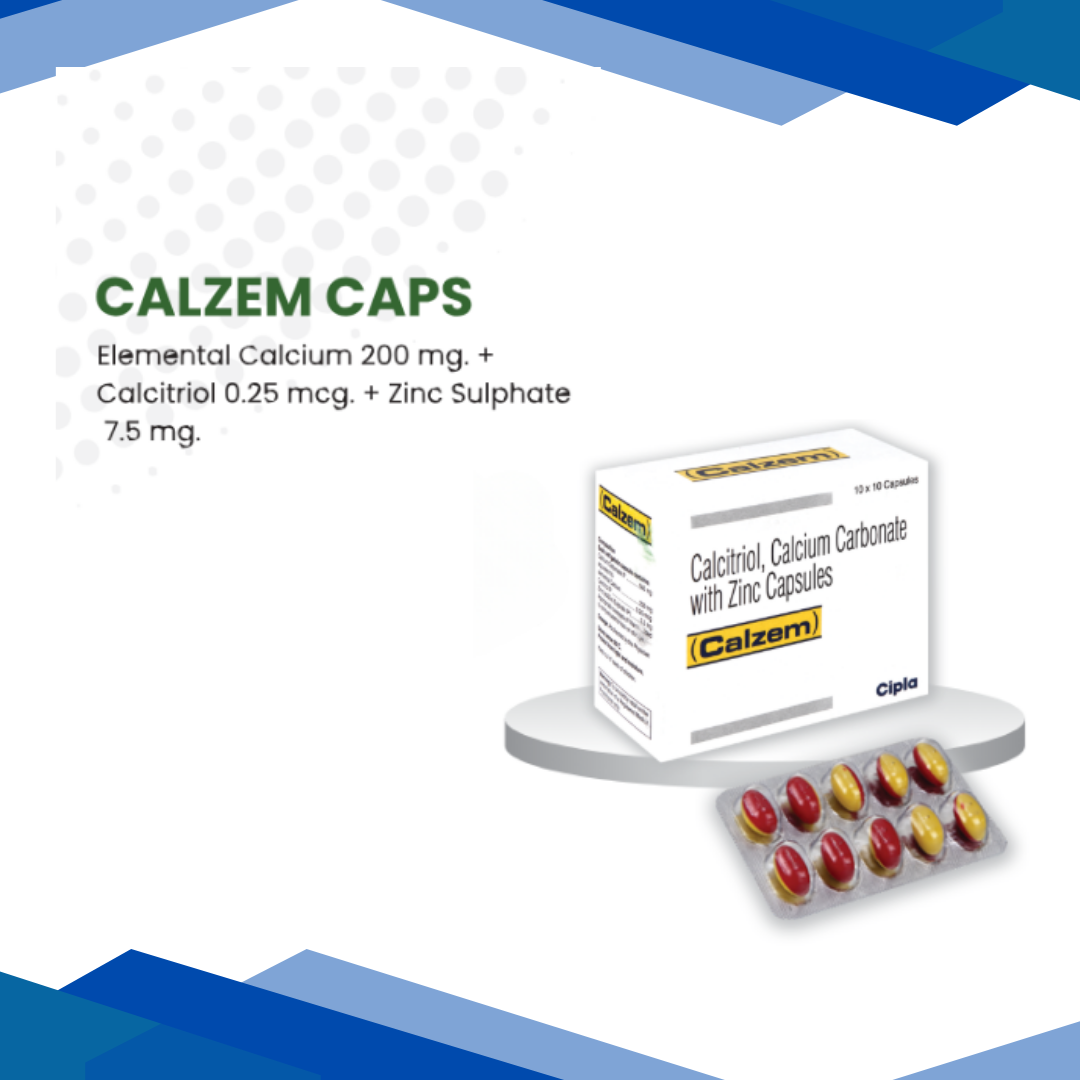 Calzem capsules combines the benefits of three key ingredients calcium (equivalent to elemental calcium), calcitriol and zinc. These ingredients work synergistically to support bone health, promote calcium absorption, and enhance overall well-being.