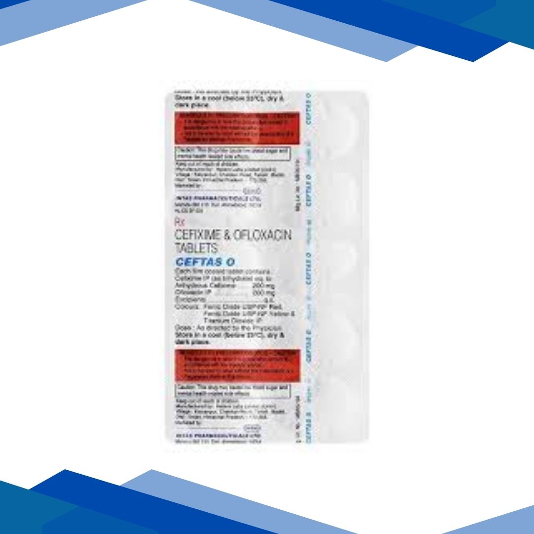 CEFTAS O TABLET is a combination of Cefixime and ofloxacin, which belongs to the group of medicines called Antibiotics. It is used in adults to manage typhoid fever (an infection caused by Salmonella typhi, accompanied by high fever, stomach pain, headache, and diarrhea).