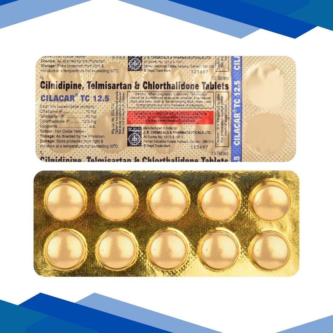 CILACAR TC 12.5MG TABLET is a combination of Chlorthalidone, Cilnidipine and Telmisartan which belongs to the group of medicines called Antihypertensive drugs. It is used to manage essential hypertension in adults. High blood pressure that is not caused by any other condition is called essential hypertension. Symptoms of essential hypertension include early morning headaches, nosebleeds, irregular heartbeat, vision changes, buzzing in the ears, fatigue (feeling overtiredness), nausea, vomiting, confusion, anxiety, chest pain, and muscle tremors (shakiness).