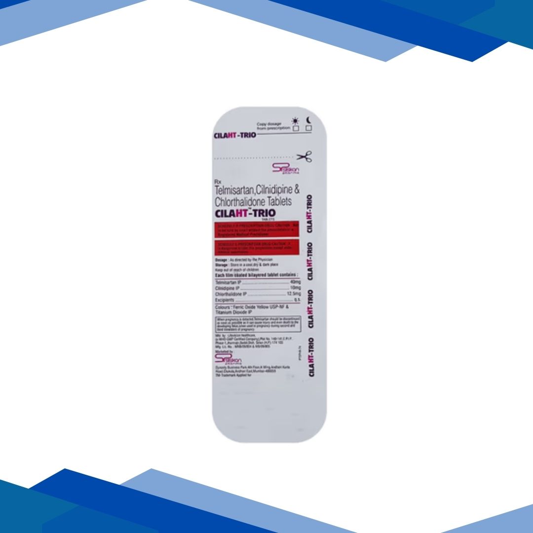 CILAHT TRIO TABLET is a combination of Chlorthalidone, Cilnidipine and Telmisartan which belongs to the group of medicines called Antihypertensive drugs. It is used to manage essential hypertension in adults. High blood pressure that is not caused by any other condition is called essential hypertension. Symptoms of essential hypertension include early morning headaches, nosebleeds, irregular heartbeat, vision changes, buzzing in the ears, fatigue (feeling overtiredness), nausea, vomiting, confusion, anxiety, chest pain and muscle tremors (shakiness).