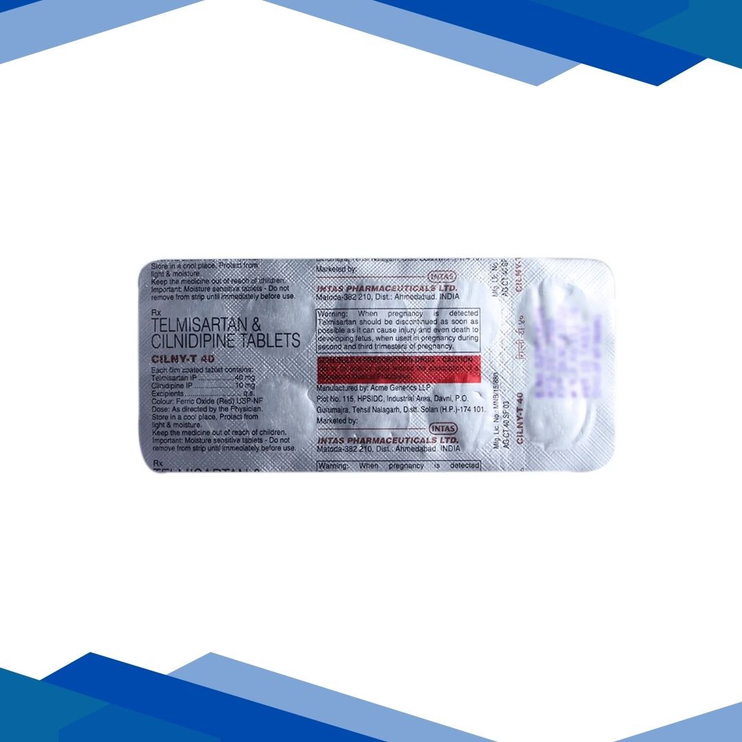 Cilny‑T 40 mg Tablet 10’s is used for the treatment of high blood pressure (hypertension). It combines two active ingredients that work together to relax and widen blood vessels and block the action of substances that tighten arteries, improving blood flow, reducing strain on the heart, and helping to lower elevated blood pressure to reduce the risk of cardiovascular complications such as heart attack and stroke when taken as prescribed. For more details click on the Medicine Salts below: