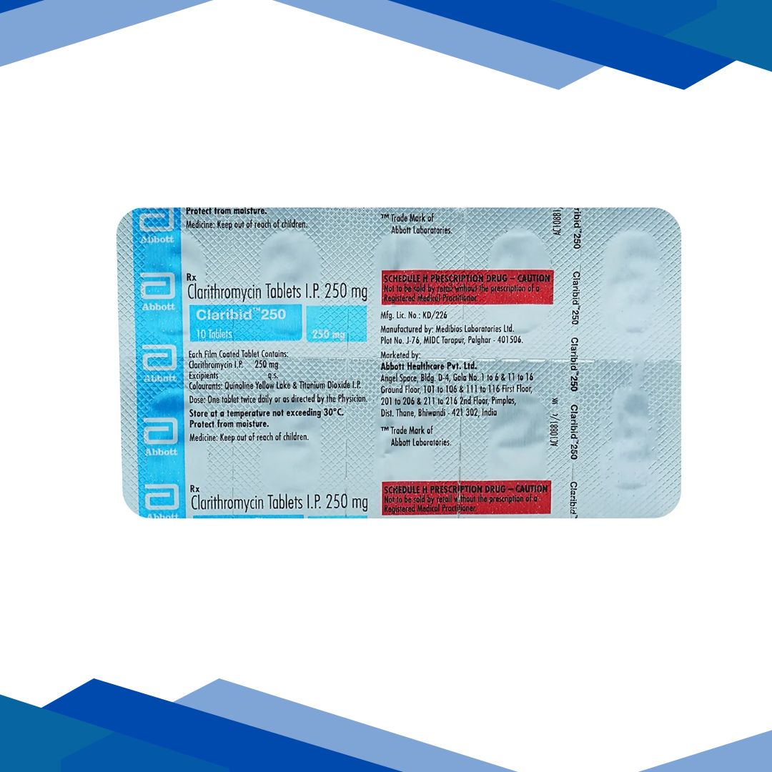 Claribid 250 Tablet is an antibiotic used to treat various types of infections. It is effective in most infections of the respiratory tract, ear, nose, throat, lungs, and skin. It is also effective against a bacteria known as H. pylori, which is associated with peptic ulcer disease. For more details kindly click on Medicines Salts Below: