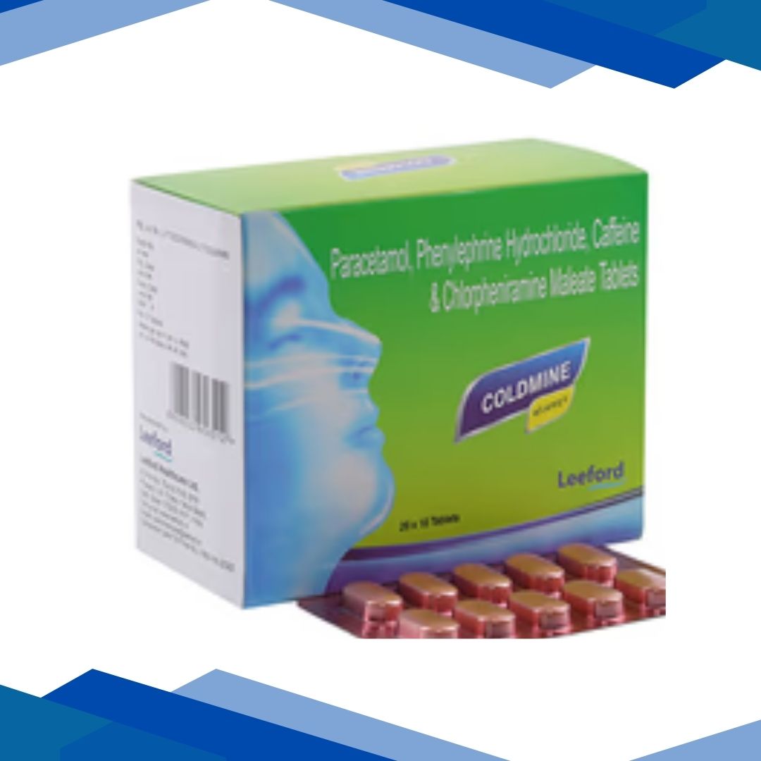 COLDMINE TABLET is a combination of Caffeine, Chlorpheniramine, Paracetamol and Phenylephrine, which belongs to the group of medicines called Central nervous system stimulants, Antihistamines, Analgesics and nasal decongestants respectively. It is used in the management of the common cold and flu to provide relief from fever, nasal congestion, headache, pain and symptoms of the nose or throat due to upper respiratory tract allergies. It is also used in bacterial infections such as sinusitis, tonsillitis and otitis media, along with other medicines.