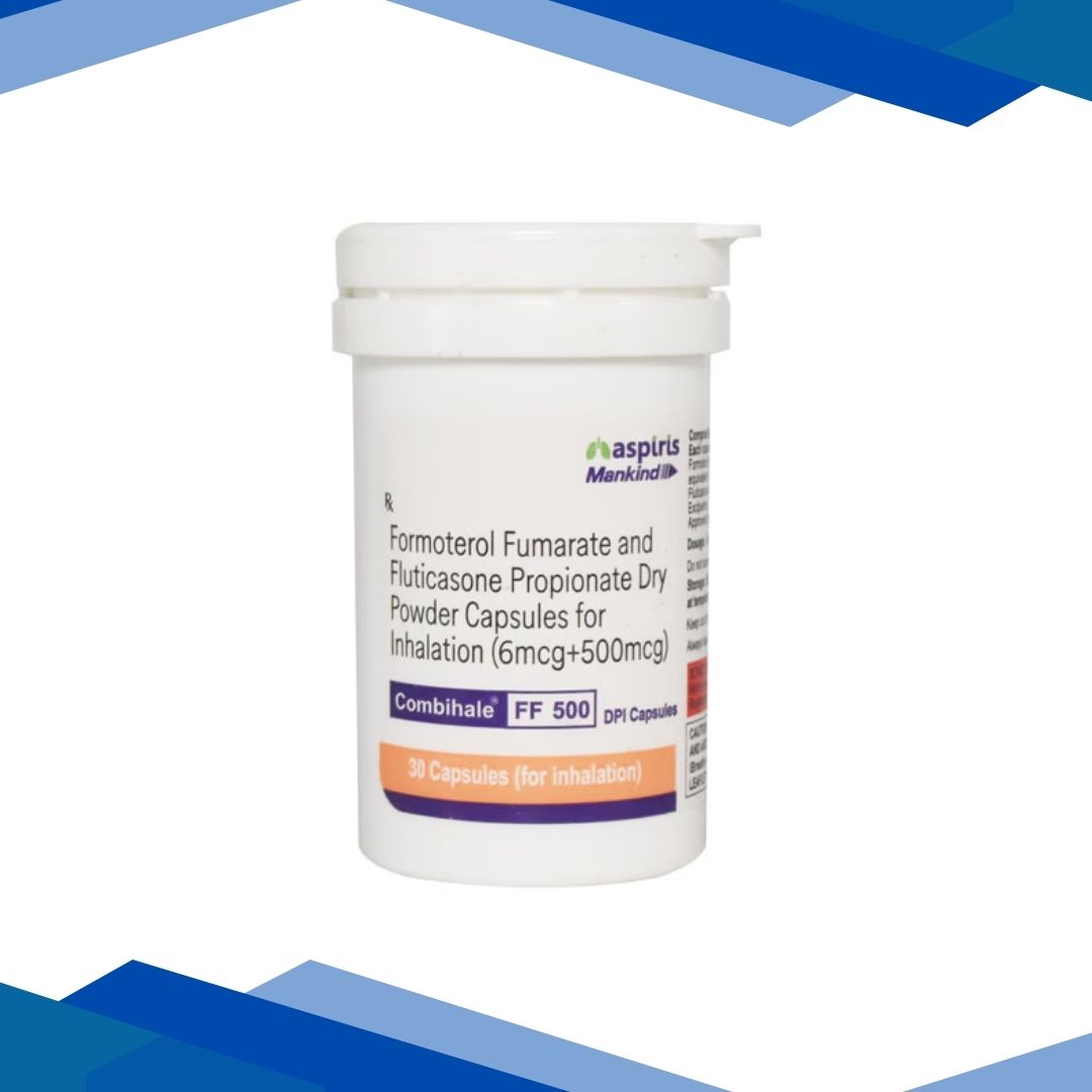 COMBIHALE FF 500 DPI CAPSULE is a combination of Fluticasone and Formoterol which belongs to the group of medicines called Steroids and Anti-asthmatic agents. It is indicated for regular management of patients with asthma and severe COPD (Chronic obstructive pulmonary disease). It refers to a group of disease that cause blockage of airflow and breathing problems. It includes emphysema and chronic bronchitis.