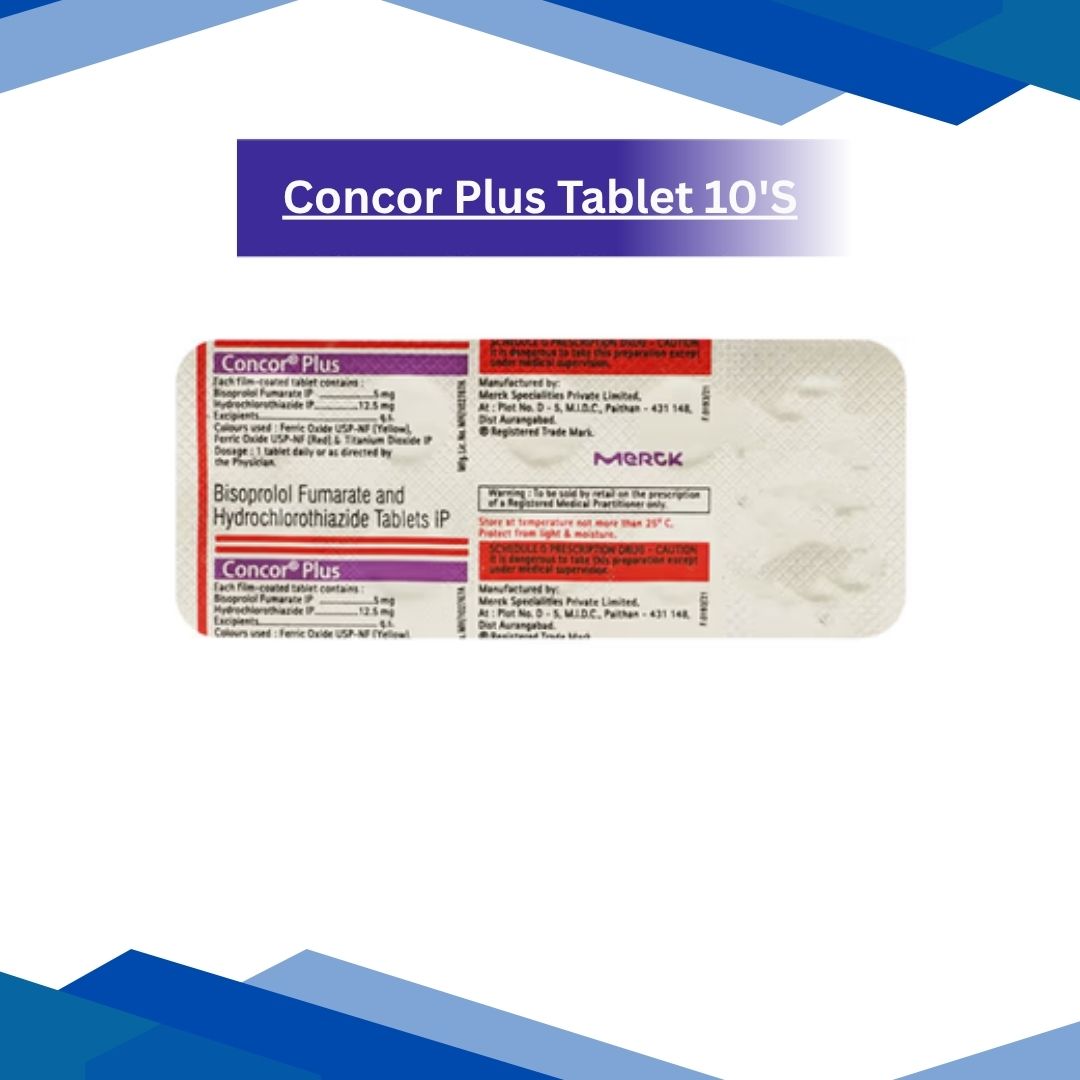 CONCOR PLUS TABLET is a combination of Bisoprolol and Hydrochlorothiazide, which belong to the group of medicines called Beta blockers and Thiazide diuretics respectively. It is used to manage hypertension. Hypertension is a condition in which the force of the blood is consistently high against the walls of the arteries, which can increase the risk of heart disease, kidney disease, and stroke. For more details kindly click on Medicine Salts Below: