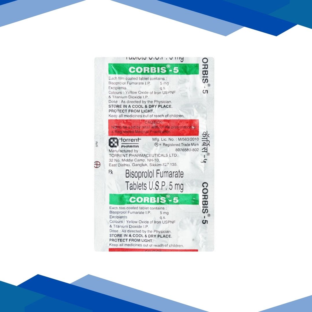 Corbis 5mg Tablet 15’s is a cardiovascular medicine used to manage high blood pressure (hypertension), relieve chest pain (angina), and help control certain heart rhythm disorders by slowing the heart rate and reducing the workload on the heart. For more details kindly click on Medicine Salts below: