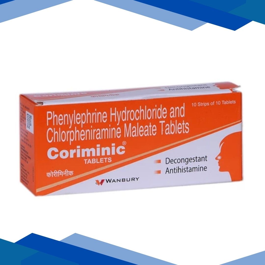 CORIMINIC TABLET is a combination of Phenylephrine and Chlorpheniramine which belongs to the group of medicines called Nasal decongestants and Antihistamines respectively. It is used to manage rhinorrhea (runny nose), common cold and congestion.