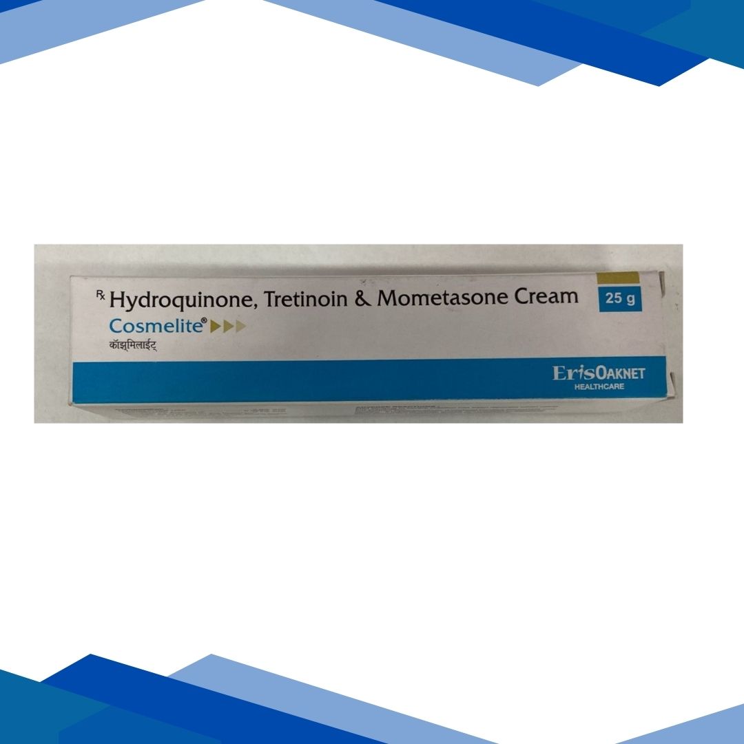 COSMELITE CREAM is a combination of Hydroquinone, Tretinoin, Mometasone furoate which belongs to the group of medicines called Depigmenting agents, Retinoids and Corticosteroids respectively. It is used in adults for the management of moderate to severe melasma (dark spots on the skin) in association with sun-avoidance measures, like using sunscreens and wearing protective clothing. Melasma is one of the most frequently acquired hyperpigmentation (excess melanin production) disorders with symptoms such as symmetrical brown patches on sun exposed areas mainly on face.