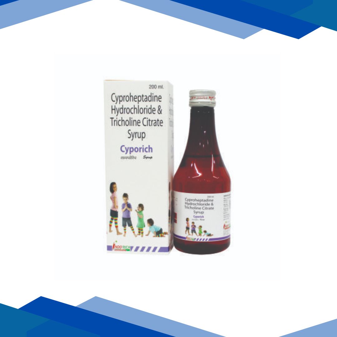 CYPORICH SYRUP is a combination of Cyproheptadine and Tricholine Citrate, which belong to the groups of medicines called antihistamines and bile acid-binding agents, respectively. It is used to manage loss of appetite, weight loss and anorexia nervosa (an eating disorder). It is also used to manage weight gain in anti-tubercular and antiretroviral regimens.