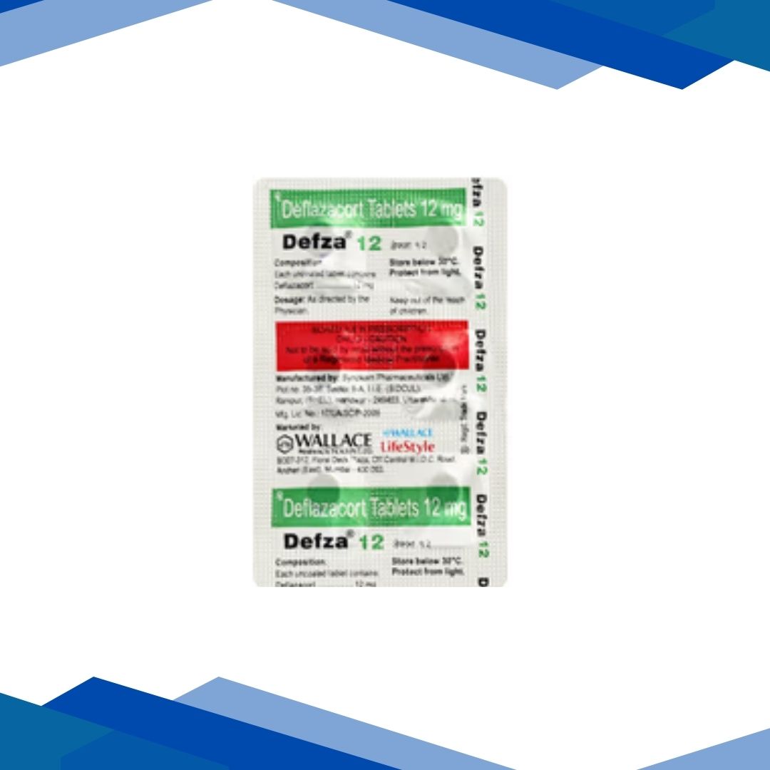 DEFZA 12 TABLET contains Deflazacort which belongs to the group of medicines called Anti-Inflammatory and Immunomodulator Drugs. It is used to manage inflammation in asthma (inflamed airways), arthritis (pain and inflammation in the joints) and allergies.