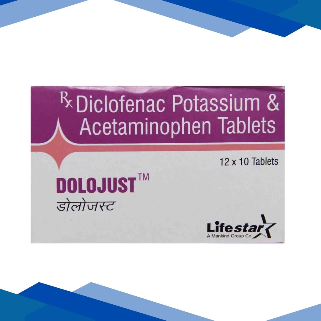 DOLOJUST TABLET is a combination of Diclofenac and Paracetamol which belongs to the group of medicines called Non-steroidal Anti-inflammatory drugs (NSAIDs). It is used to manage various conditions associated with pain and inflammation such as rheumatoid arthritis (chronic inflammatory condition of joints), ankylosing spondylitis (chronic inflammatory disease of the spine) and osteoarthritis (degenerative joint disorder which is categorized by swelling, stiffness, and painful joints). DOLOJUST TABLET can also be used in the management of ear and throat pain, muscle pain, back pain, tooth ache, mensural pain, post-operative or post -traumatic pain and also athletic injuries.