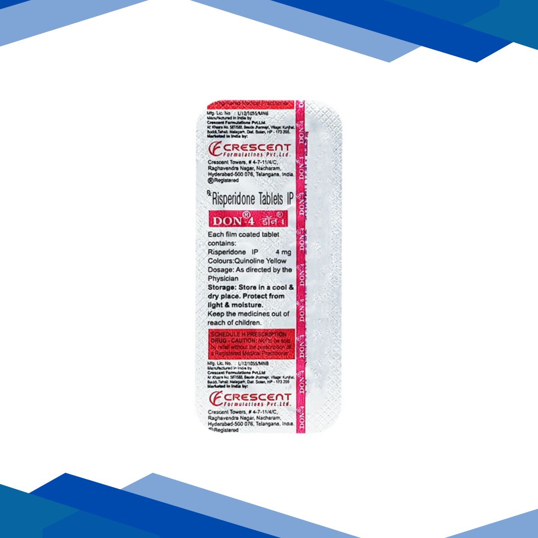 Don 4 Tablet 10’s is an antipsychotic medicine containing risperidone used to manage psychiatric conditions such as schizophrenia, bipolar disorder (mania), and behavioural symptoms by balancing certain chemical messengers in the brain to improve mood, behaviour, and thinking. For more details kindly click on Medicine Salts below: