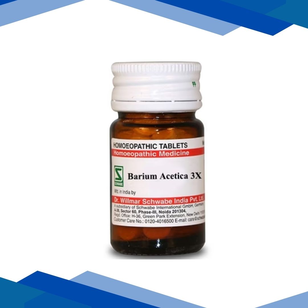 Dr Willmar Schwabe India Barium Acetica Trituration Tablet is a homeopathic remedy which is used to treat multiple health complications including swollen tonsils, urine retention, hardened testes and in children it can be used as a growth booster to increase height.