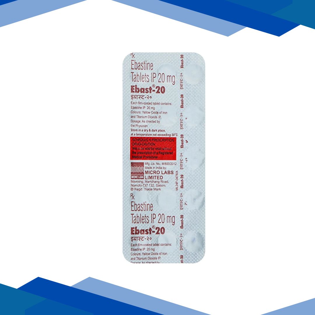 EBAST 20MG TABLET contains Ebastine, which belongs to the group of medicines called Antihistamines. It is used in adults and children above 12 years of age for the management of seasonal and persistent allergic rhinitis (runny nose), with or without allergic conjunctivitis (inflammation of the eye). For More detail kindly click on Medicine Salts Below: