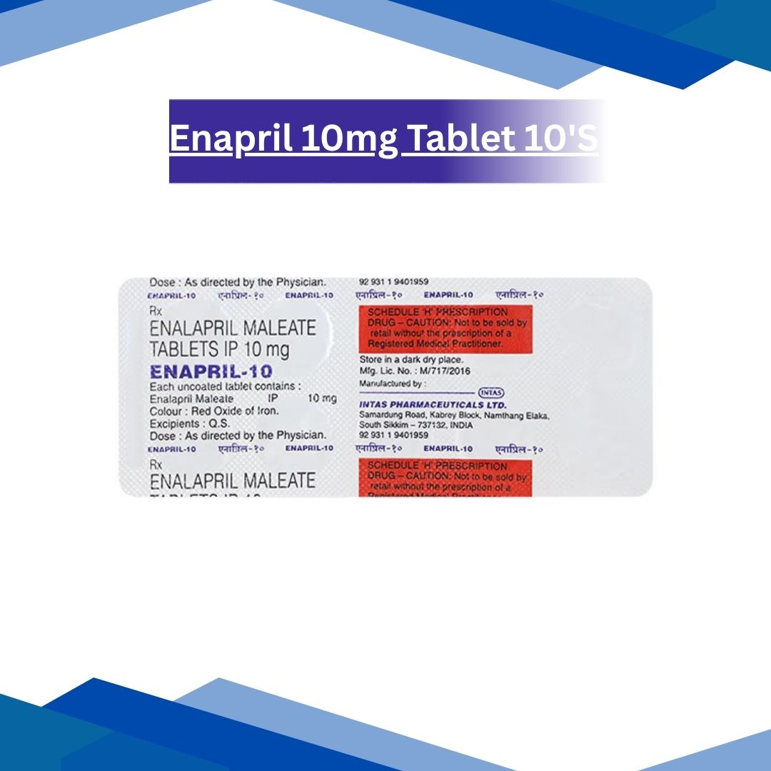 ENAPRIL 10MG TABLET contains Enalapril, which belongs to the group of medicines called Angiotensin Converting Enzyme (ACE) Inhibitors. It is used to manage hypertension (high blood pressure) and heart failure. It also manages the onset of signs of symptoms of heart failure (such as difficulty breathing, swollen ankles and feet, or extreme tiredness even after a mild physical activity).