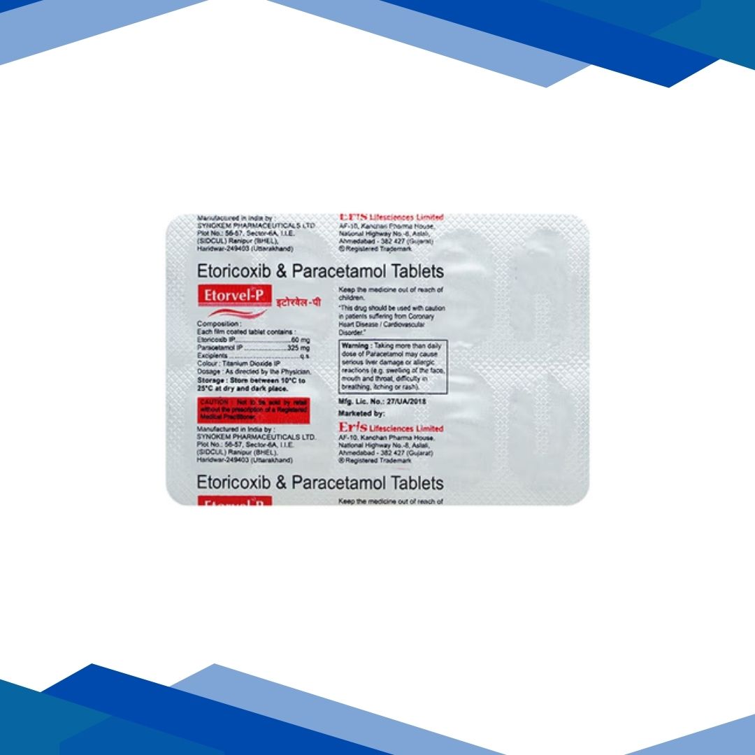 Etorvel P 60/325mg Tablet 10’s is a pain‑relief and anti‑inflammatory combination medicine used to reduce pain, inflammation, swelling, and fever associated with conditions like osteoarthritis, rheumatoid arthritis, ankylosing spondylitis, back pain, toothache, headache, and general musculoskeletal pain by blocking pain‑producing chemical messengers and reducing fever. For more details kindly click on Medicine Salts below: