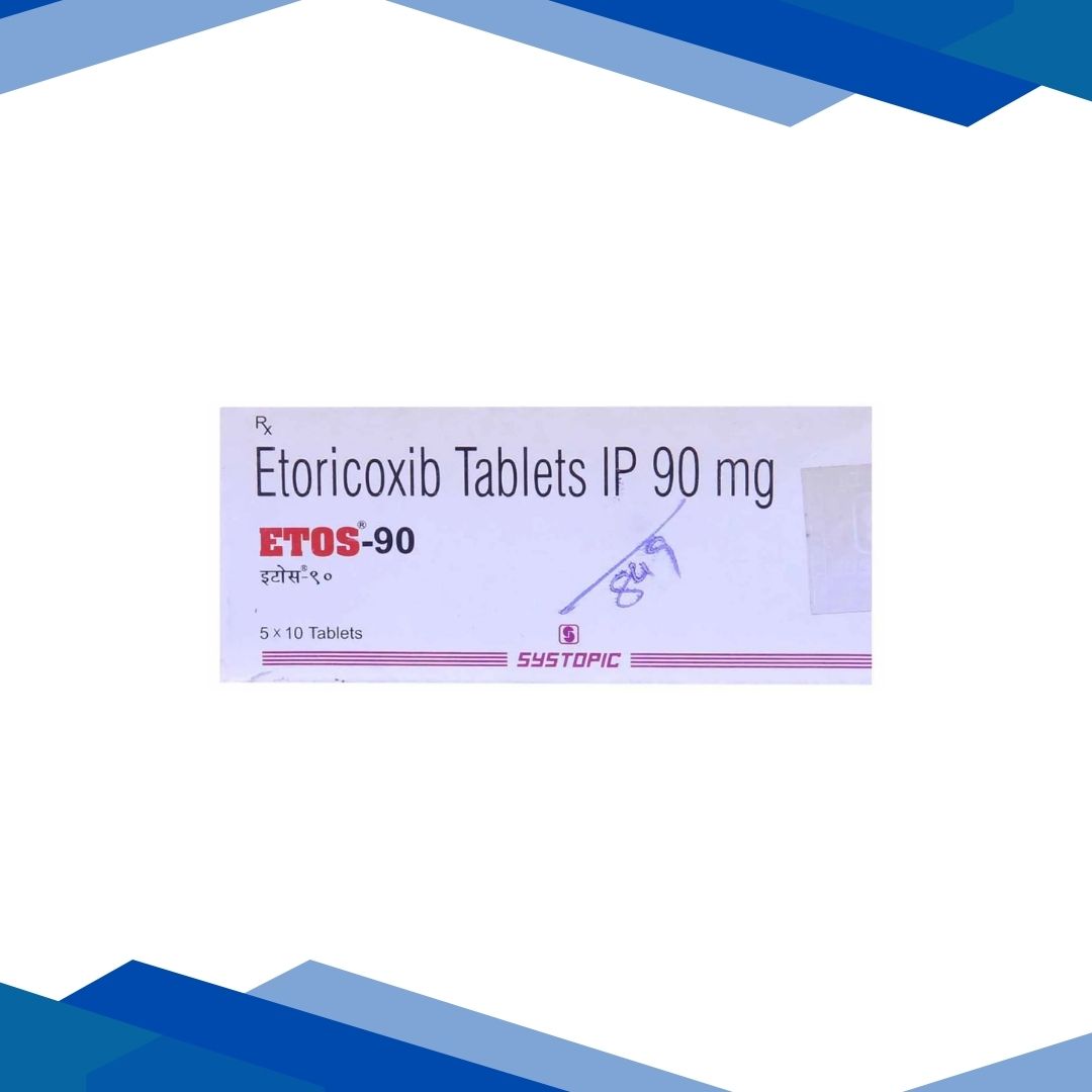 ETOS 90MG TABLET is used to reduce pain and swelling associated with inflammatory bone conditions such as osteoarthritis, rheumatoid arthritis, ankylosing spondylitis (inflammation of the spine), and gout (joint pain caused by excessive accumulation of uric acid in between the joints). It can also be used to reduce pain following a dental surgery. It contains Etoricoxib, which belongs to the group of medicines called Non-Steroidal Anti-Inflammatory Drugs. It works by blocking the release of certain chemicals (prostaglandins) in the body that cause pain, swelling, and inflammation, thereby reducing pain and inflammation associated with inflammatory conditions.