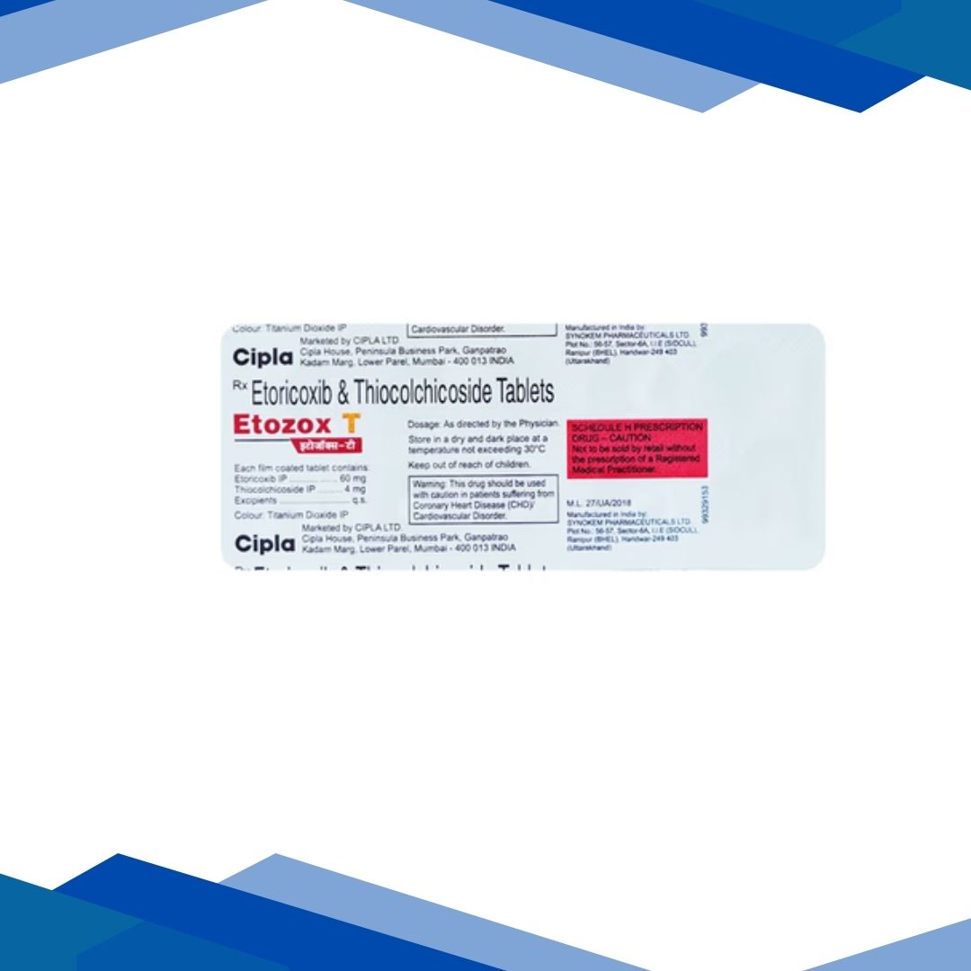 ETOZOX T TABLET is a combination of Etoricoxib and Thiocolchicoside which belongs to the group of medicines called Non-steroidal anti-inflammatory drugs (NSAID) and Muscle relaxants. It is used to reduce pain and swelling in the joints and muscles in osteoarthritis, rheumatoid arthritis, ankylosing spondylitis, gout and muscle spasm. This medicine is also used for the short-term management after dental surgery for moderate pain. Muscle spasm is the rapid spontaneous contractions of the muscle, which can be painful and uncomfortable. When the nerve impulses are damaged or interrupted that control muscle movement, it could lead to muscle spasms. Symptoms include muscle tightness, joint stiffness, unusual posture, difficulty in moving and pain in affected muscles and joints.