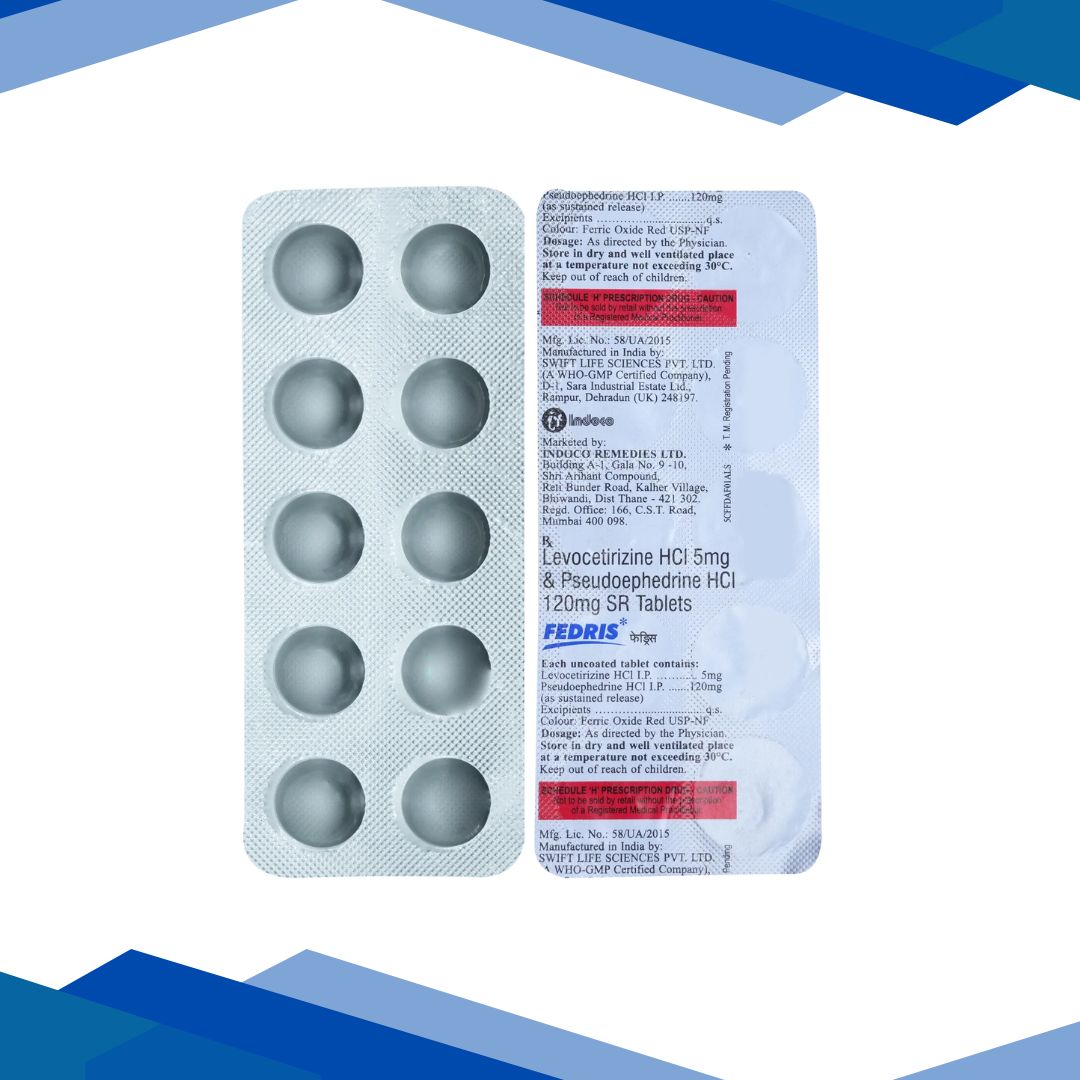 Fedris 5mg/120mg Tablet is a combination medicine used in the treatment of allergy symptoms like runny nose, sneezing, throat irritation, watery eyes and congestion or stuffiness in the nose.