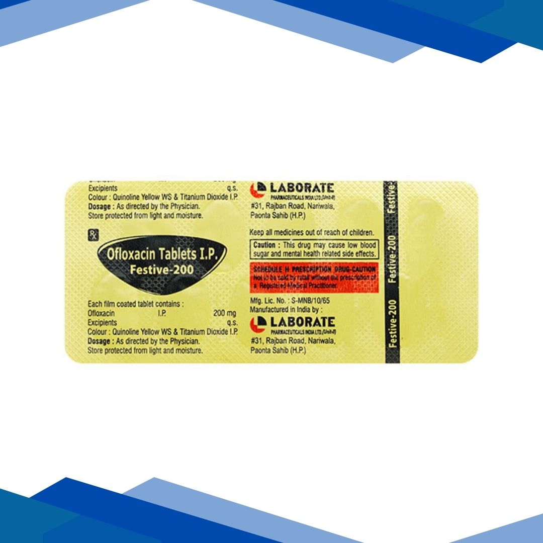 FESTIVE 200 TABLET contains Ofloxacin, which belongs to the group of medicines called Antibiotics. It is used to manage various bacterial infections involving the respiratory system, urinary system (kidneys and bladder), both male and female genital organs (such as gonorrhoea), ears, nose, skin and soft tissues. Bacterial infections are generally characterized by fever, extreme tiredness, swollen lymph nodes in the neck, armpits, groin or elsewhere, headache, nausea or vomiting.