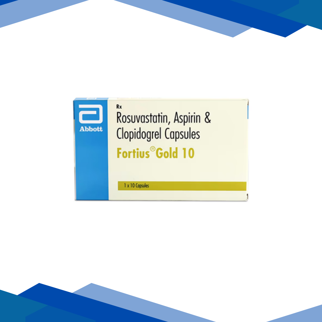 FORTIUS GOLD 10 Capsule are used to lower cholesterol and prevent blood clots in people with heart disease. This combination helps reduce the risk of heart attack, stroke, and complications after stent placement. For more details kindly click on Medicine Salts below: