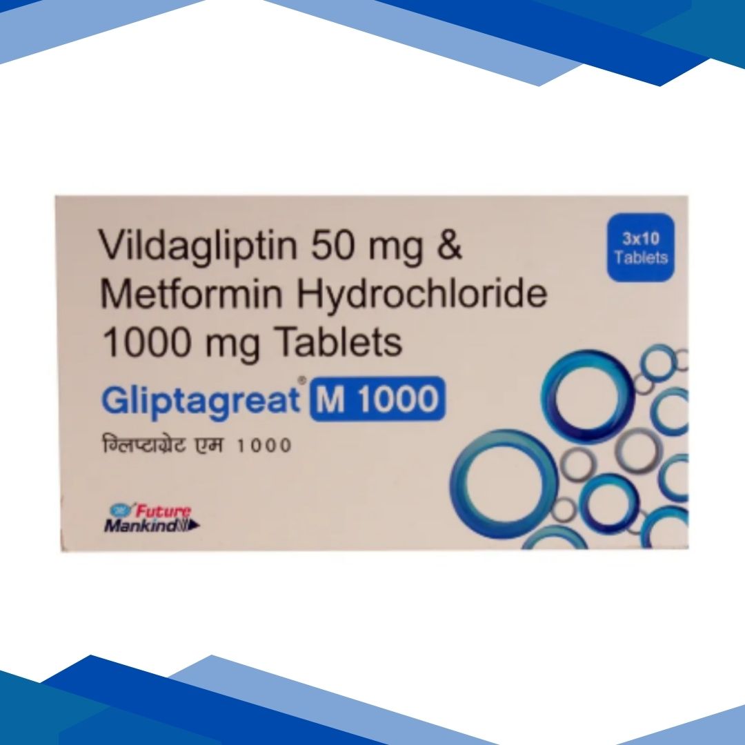 GLIPTAGREAT M 1000MG TABLET is used to manage type 2 diabetes (non-insulin-dependent diabetes mellitus) in adult patients whose diabetes cannot be controlled by diet and exercise alone and/or with other medicines used to manage diabetes (insulin or sulphonylureas such as glimepiride and glipizide). It is a combination of Metformin and Vildagliptin which belongs to a group of medicines called Antidiabetic agents.