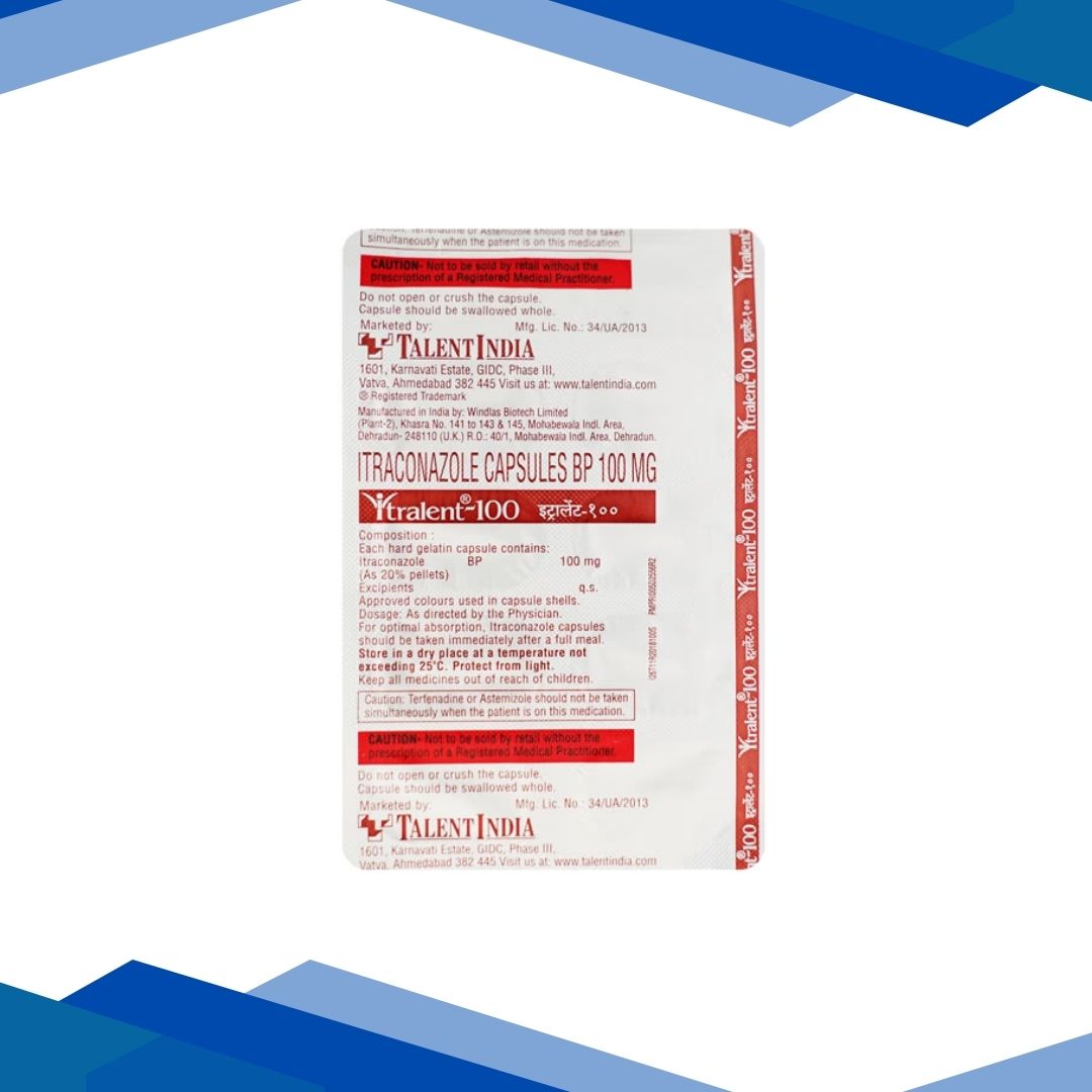 Itralent 100mg Capsule is an antifungal medicine used to treat various fungal infections of the skin, mouth, throat, lungs, and nails by stopping the growth of infection-causing fungi in the body. For more details kindly click on Medicine Salts below: