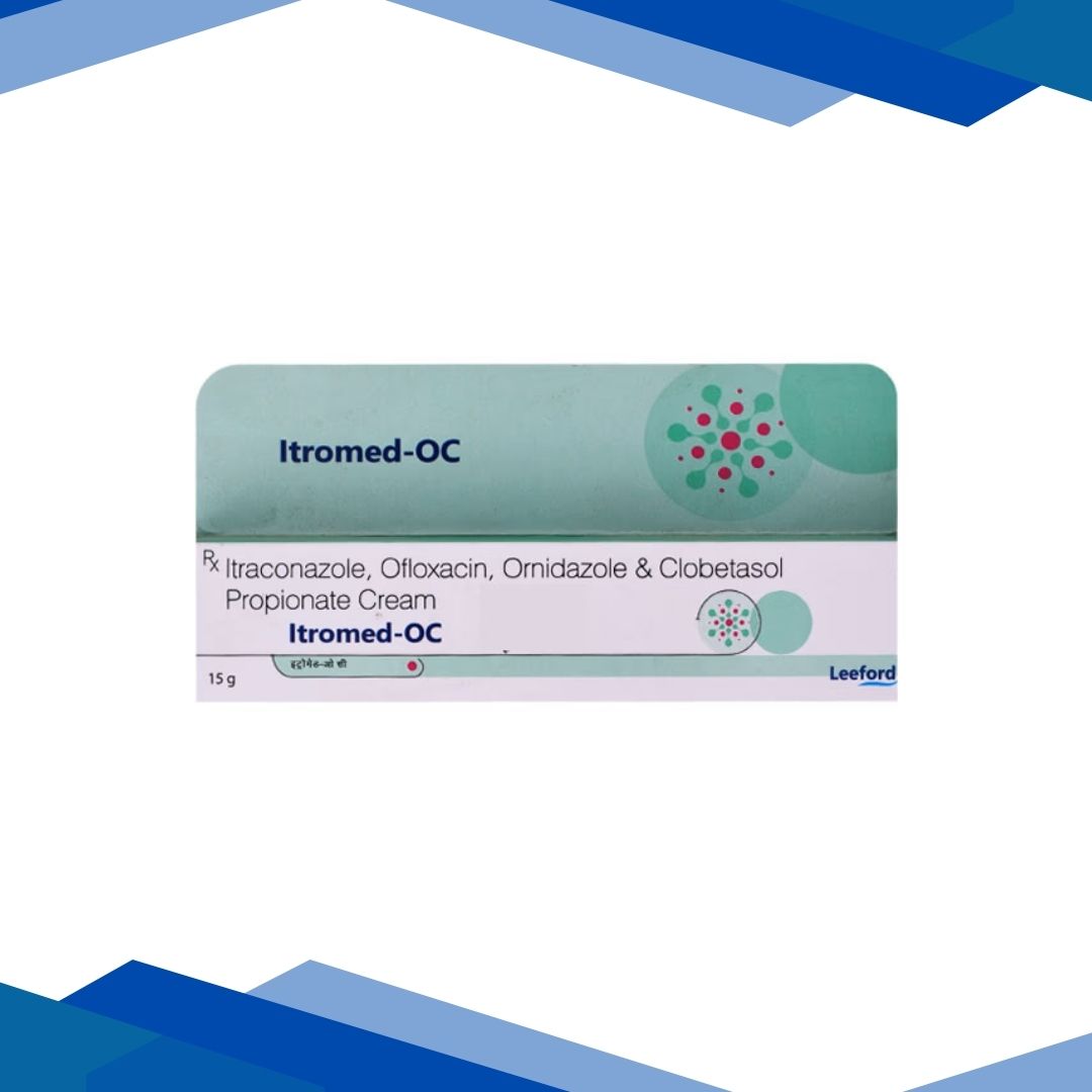 ITROMED OC CREAM is a combination of Clobetasol, Itraconazole, Ofloxacin and Ornidazole which belongs to a group of medicines known as Corticosteroids, Antifungals, Antibiotics and Antibacterial. It is used to manage bacterial, fungal infections, skin infections such as dermatitis, inflammatory dermatomes (inflammation of skin region which is related to nerves, and it is characterised by pain, tingling sensation) and lichen planus (irritation and swelling of hair, nails, skin and mucous membranes).