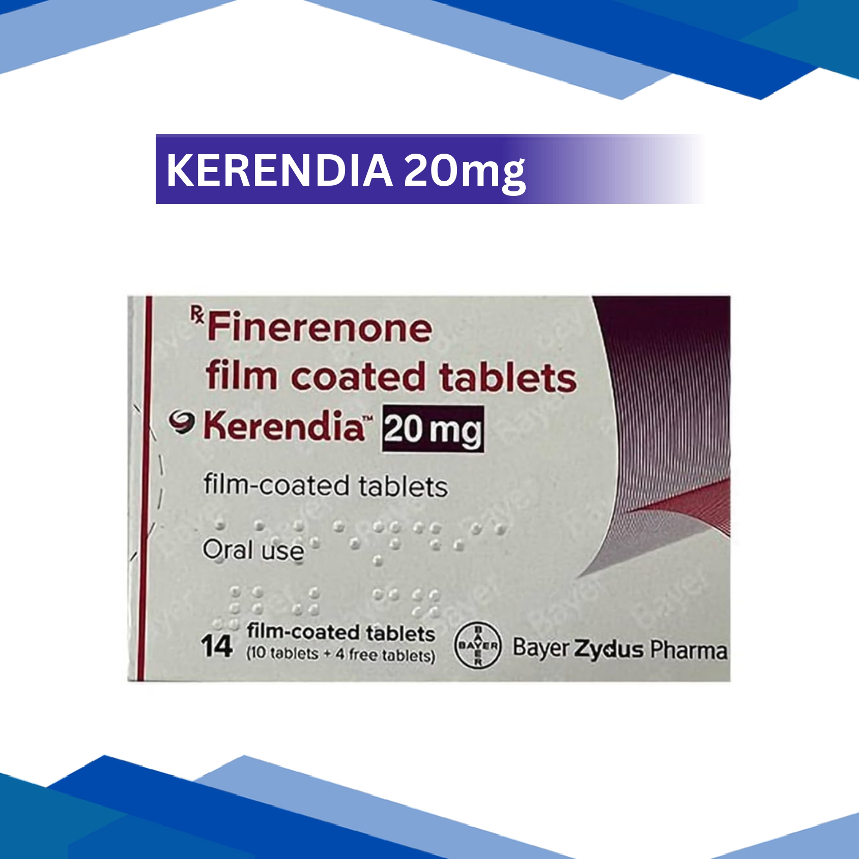 Kerendia 20 mg Tablet contains Finerenone, a selective mineralocorticoid receptor antagonist. It is used to reduce the risk of sustained decline in kidney function, end-stage kidney disease, cardiovascular death, non-fatal myocardial infarction, and hospitalization for heart failure in adult patients with chronic kidney disease associated with type 2 diabetes. Finerenone works by blocking the action of certain hormones (mineralocorticoids) that can damage your kidneys and heart. For more details kindly click on Medicine Salts below: