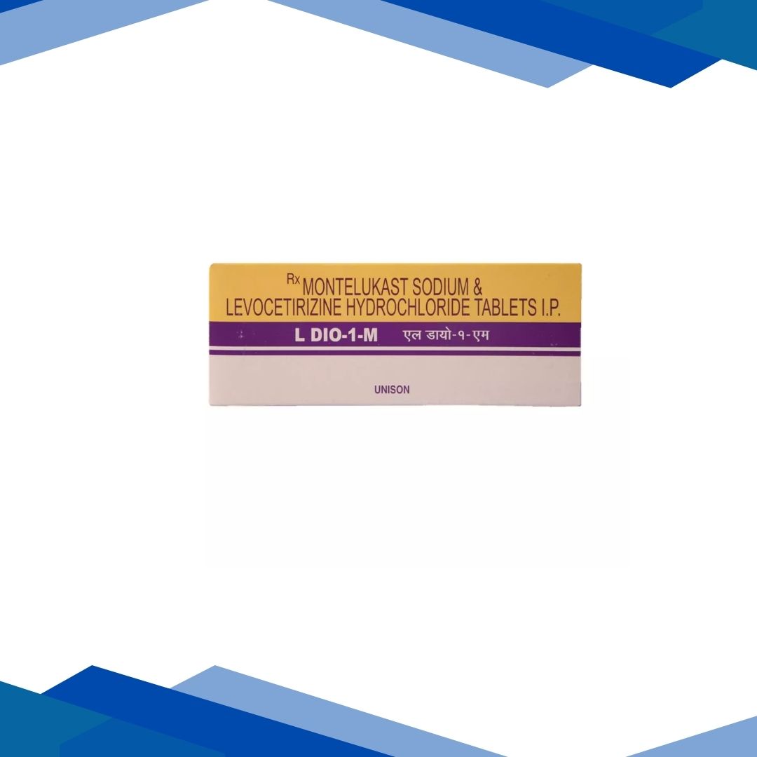 L DIO 1 M TABLET is used in the management of signs and symptoms of allergic rhinitis (sneezing, runny or stuffy nose, nasal itching, red, watery or itchy eyes, throat irritation, cough, headache and tiredness), chronic idiopathic urticaria (allergic skin reaction with red raised itchy bumps on skin) and bronchial asthma.