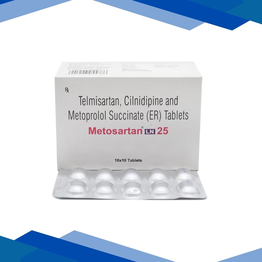 Metosartan LN 25 Tablet 10’s is used for the treatment and management of high blood pressure (hypertension). It combines three active ingredients that work together to relax and widen blood vessels, slow the heart rate, and block hormonal signals that tighten arteries, helping improve blood circulation and effectively lower elevated blood pressure to reduce the risk of cardiovascular complications such as heart attack and stroke when taken as prescribed. For more details click on the Medicine Salts below:
