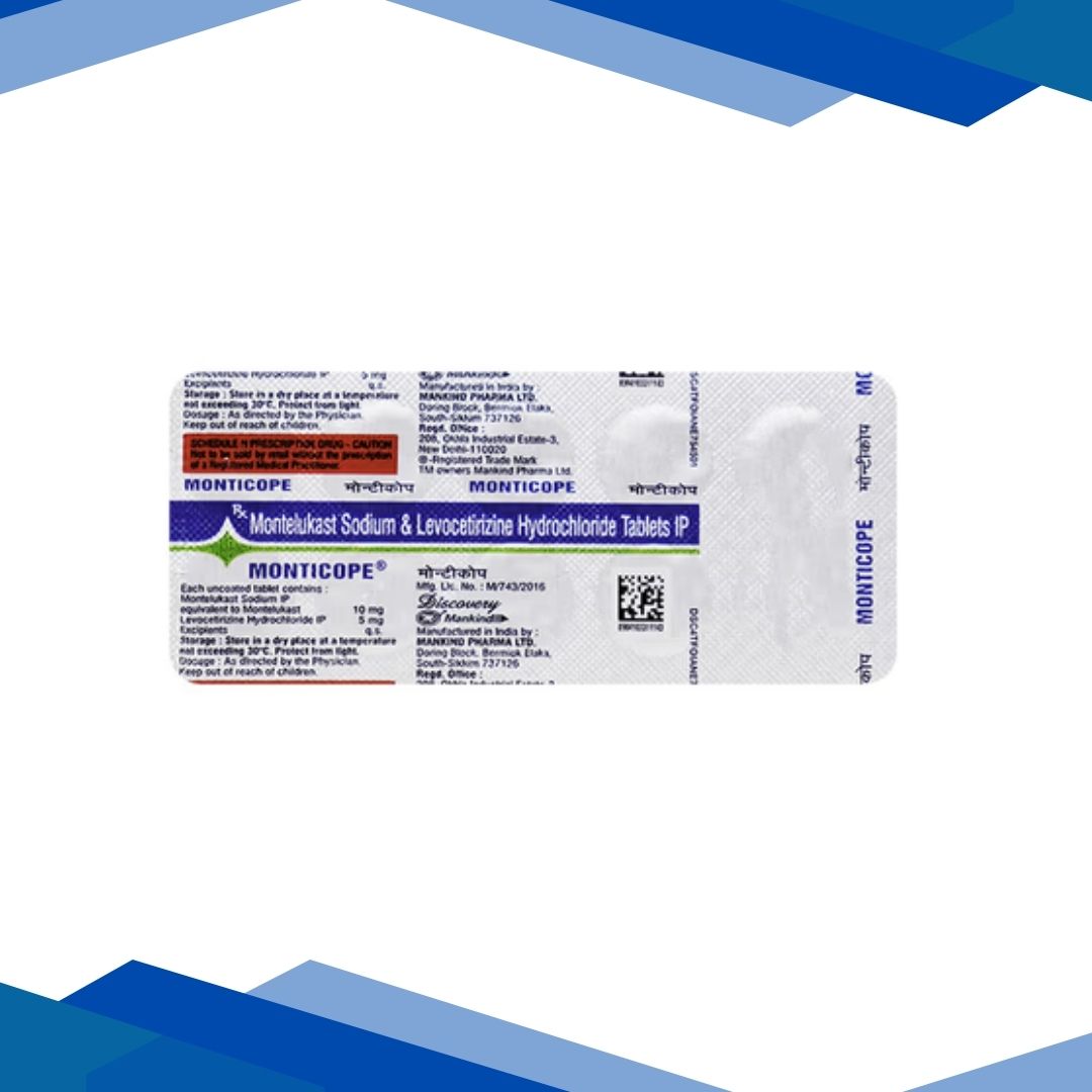 MONTICOPE TABLET is used in the management of signs and symptoms of allergic rhinitis (sneezing, runny or stuffy nose, nasal itching, red, watery or itchy eyes, throat irritation, cough, headache and tiredness), chronic idiopathic urticaria (allergic skin reaction with red raised itchy bumps on skin) and bronchial asthma.