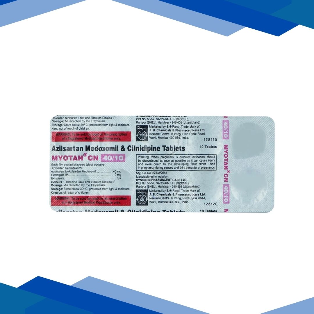 Myotan CN 40mg/10mg Tablet 10’s is used for the treatment and management of high blood pressure (hypertension). It combines two active ingredients that work together to relax and widen blood vessels and reduce strain on the heart for better blood flow and blood pressure control, which can help lower the risk of heart attack and stroke when taken as prescribed. For more details click on the Medicine Salts below: