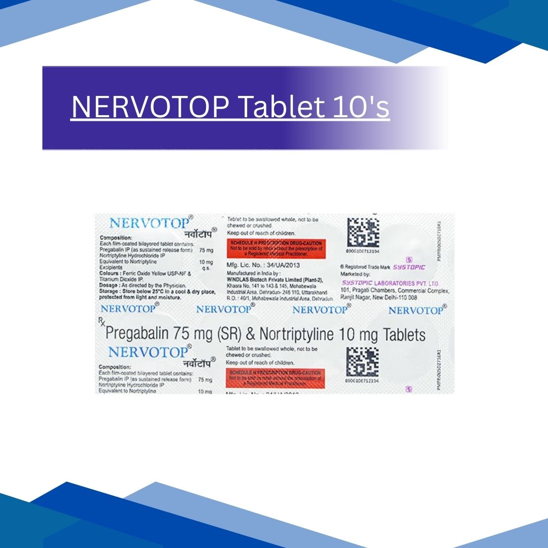 NERVOTOP TABLET is a combination of Nortriptyline and Pregabalin which belongs to the group of medicines called Tricyclic antidepressants and Anticonvulsants respectively. NERVOTOP TABLET is indicated for the management of neuropathic pain. Neuropathic pain is a chronic painful nerve condition caused by damage or disease affecting the somatosensory (sense of touch) nervous system.