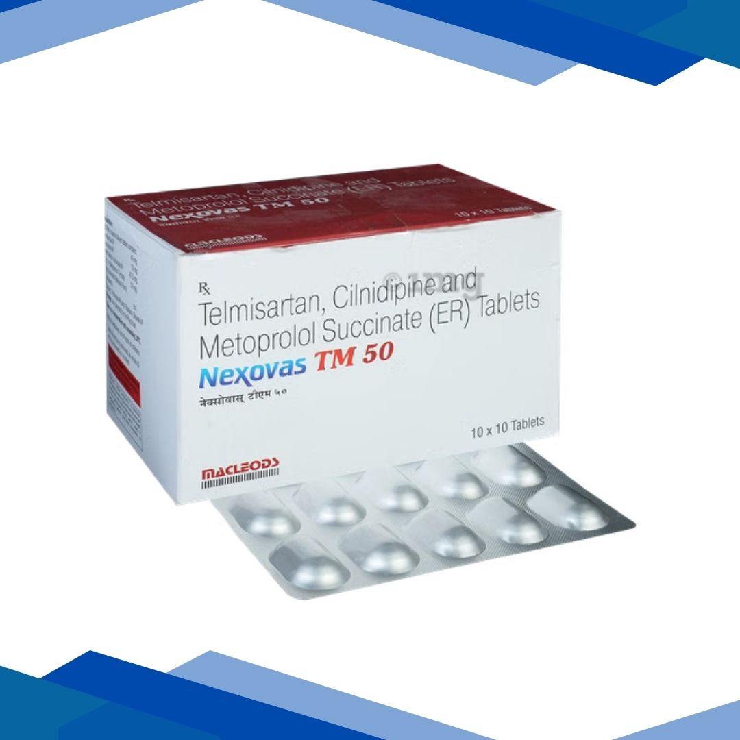 Nexovas TM 50 Tablet 10’s is used for the treatment and management of high blood pressure (hypertension). It combines multiple active ingredients that relax and widen blood vessels and slow the heart rate to improve blood flow and help lower elevated blood pressure, which supports cardiovascular health when taken as prescribed. For more details click on the Medicine Salts below: