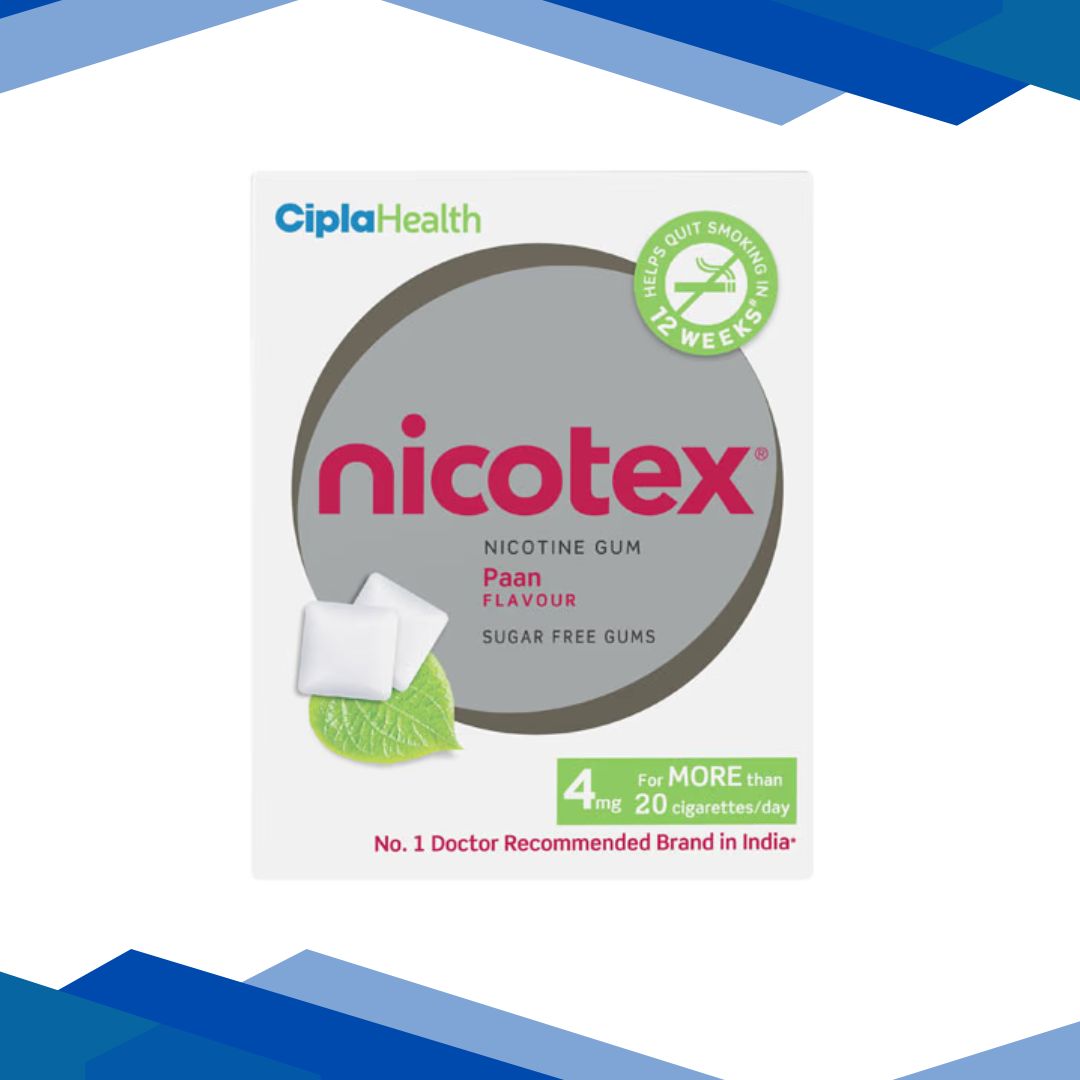 Nicotex Paan Flavour Sugar Free Nicotine Gum 4 mg 12’s is a nicotine replacement therapy chewing gum used to help people reduce cravings and withdrawal symptoms associated with quitting smoking or reducing tobacco use by providing controlled doses of nicotine without the harmful smoke of tobacco. For more details kindly click on Medicine Salts below:
