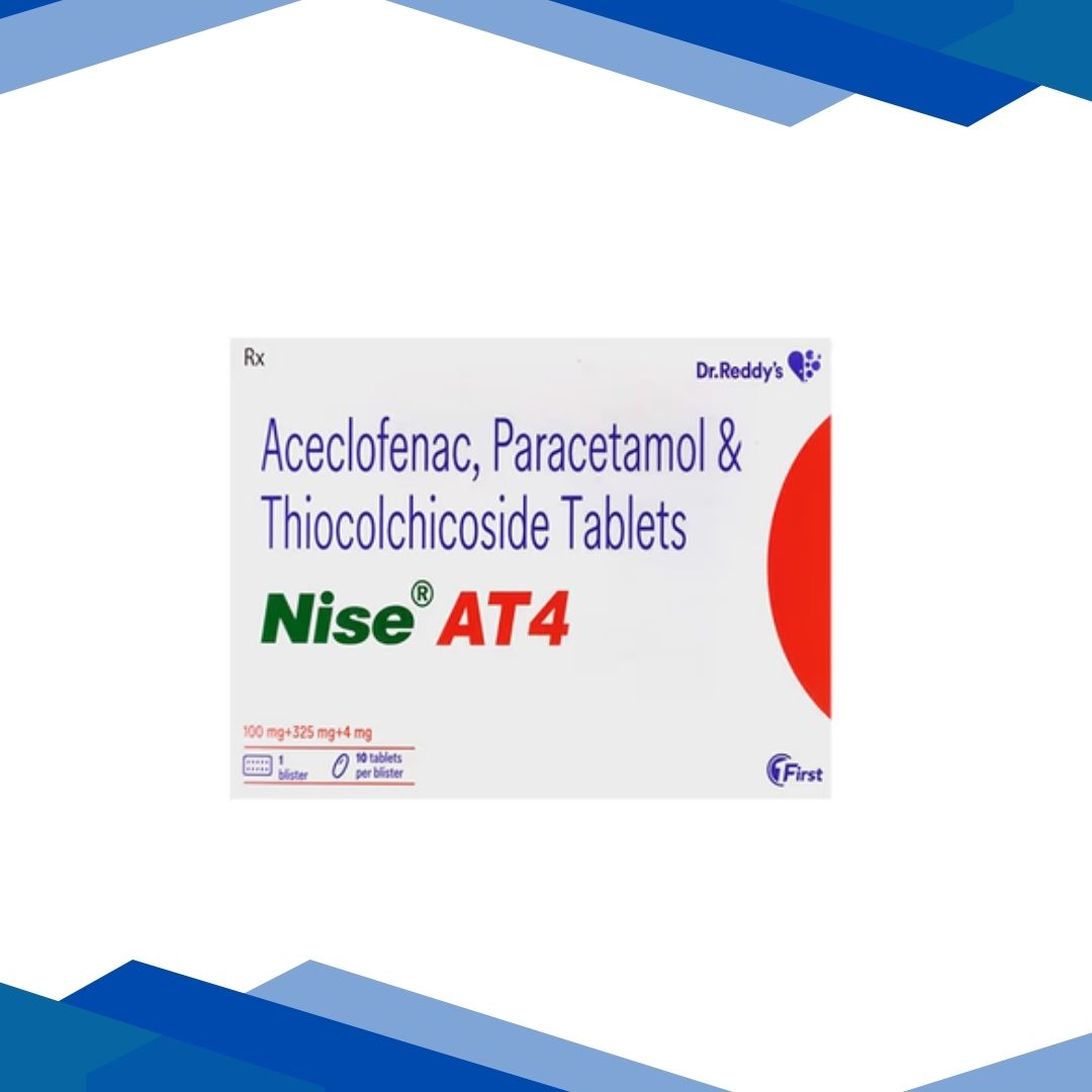 Nise AT 4mg Tablet 10’S is a prescription medicine used to relieve pain, inflammation, and muscle stiffness. It contains Aceclofenac and Thiocolchicoside, which reduce pain and relax muscles. For more details kindly click on Medicine Salts below: