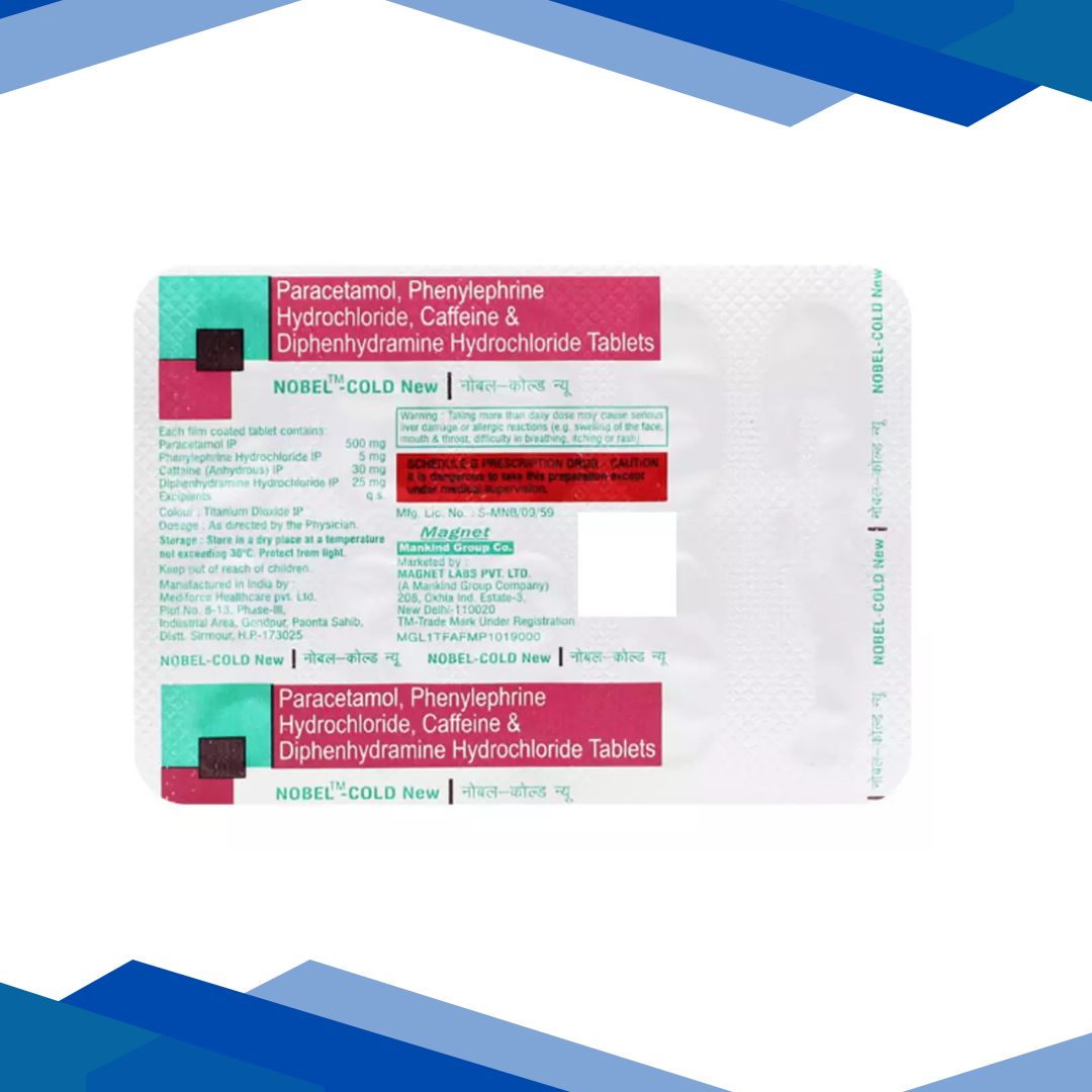 NOBEL COLD NEW TABLET is a combination of Caffeine, Diphenhydramine, Paracetamol, and Phenylephrine which belongs to the group of medicines called CNS Stimulants, Antihistamines, Analgesics-Antipyretics, and Nasal Decongestants respectively. It is used to relieve flu and cold symptoms, headache, body ache, extreme weakness, watery eyes, fever, cough, sore throat, sneezing, runny, and congested nose.