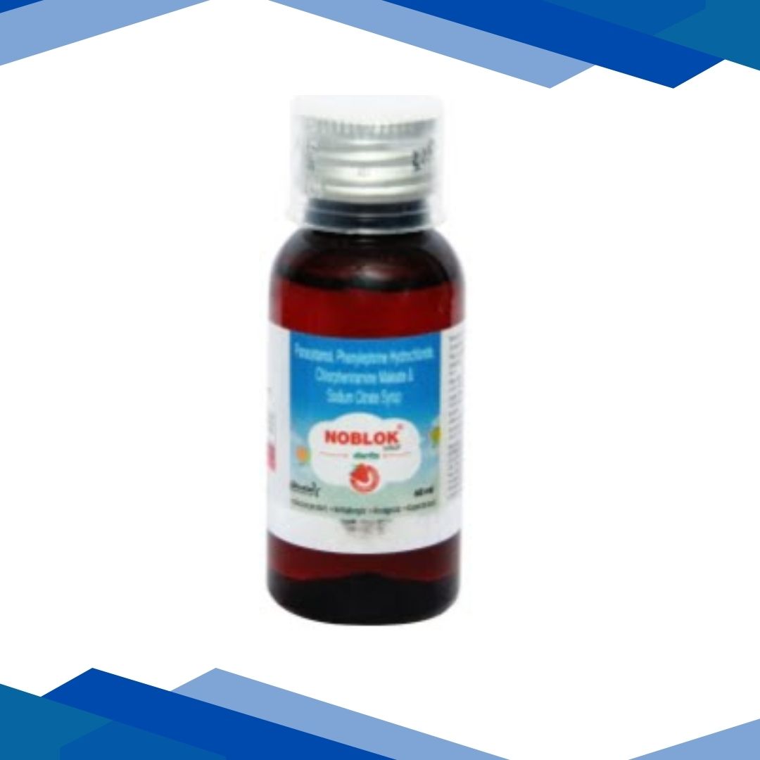 NOBLOK SYRUP contains Chlorpheniramine maleate, Paracetamol, phenylephrine, and Sodium citrate which belong to the group of medicines called antihistamines, analgesics, nasal decongestants, and mucolytics respectively. It is used in children to manage and relieve symptoms of the common cold, cough, hay fever(seasonal allergy) and other respiratory conditions.