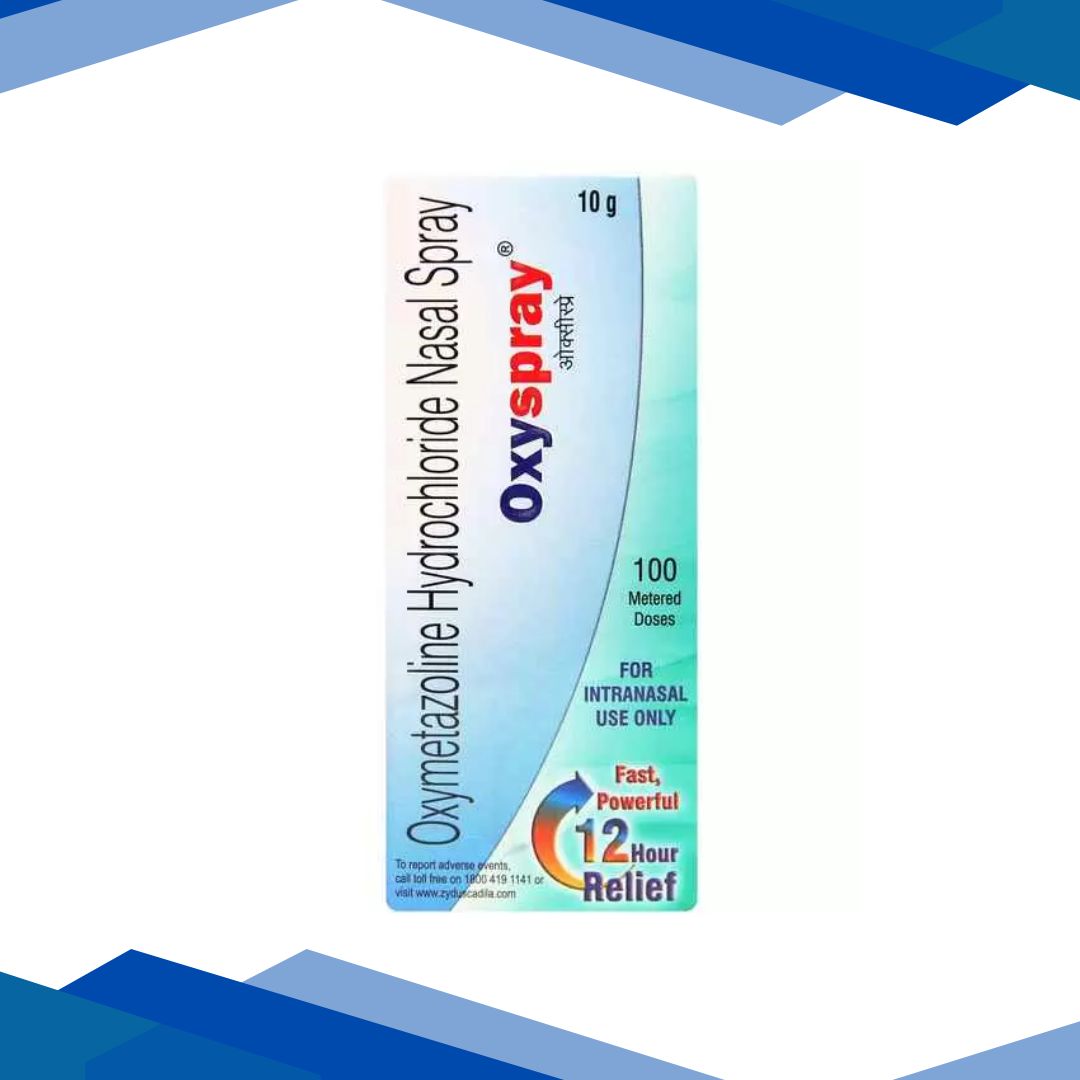 OXYSPRAY SPRAY contains Oxymetazoline which belongs to the group of medicines called Nasal decongestants. It is used in adults and in adolescents (aged 12 years or above) to provide relief from nasal congestion, itching and discomfort caused due to common cold, sinusitis (inflammation of the sinuses) or allergic rhinitis (an allergic condition).