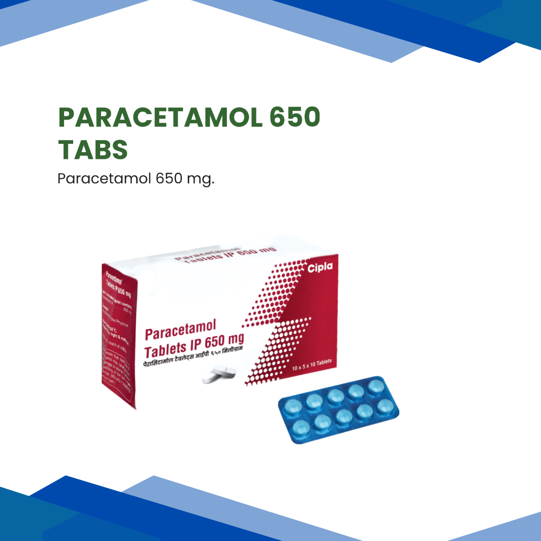 Paracetamol 650  TABLET contains Paracetamol which belongs to the group of medicines called Analgesics and Antipyretics. It is used to relieve mild to moderate pain (including headaches, backache, toothache, severe nerve pain, sore throat, period pain, low back and leg pain, muscle, connective tissue and joint pain, symptomatic relief of sprains, strain, joint swelling and stiffness). It is also used to lower fever
