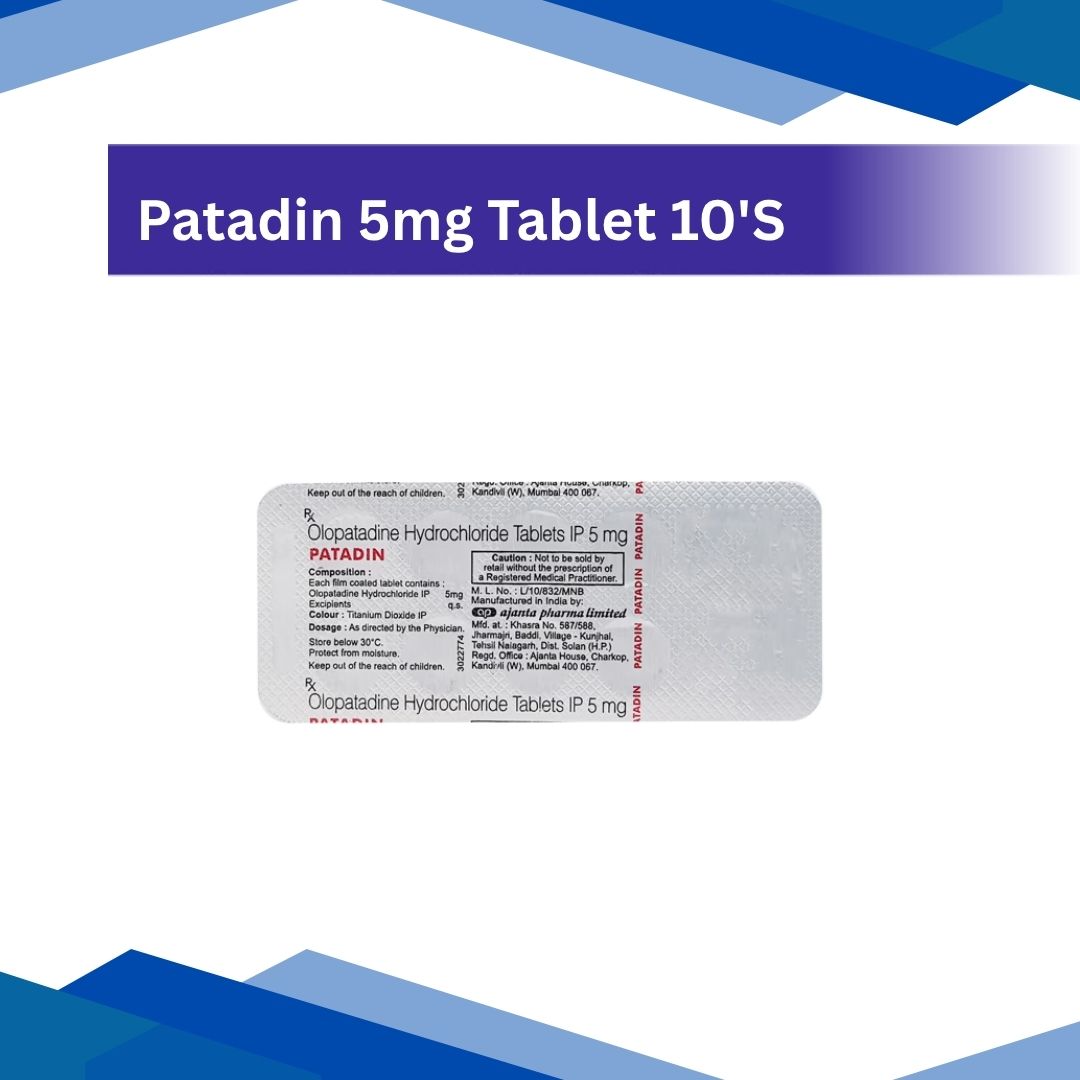 Patadin 5mg Tablet is an antihistamine medication used to treat various allergic conditions such as allergic rhinitis (hay fever), conjunctivitis (eye allergies), and chronic urticaria (hives). It works by blocking the action of histamine, a substance in the body that causes allergic symptoms like itching, swelling, and rashes. For more details kindly click on Medicine Salts below: