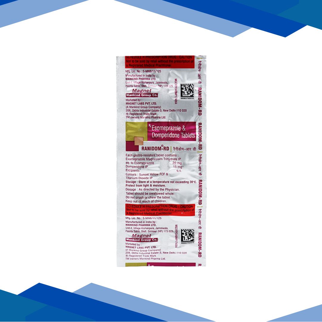 RANIDOM RD 15/20MG TABLET is a combination of Domperidone and Esomeprazole which belongs to the group of medicines called Prokinetic Drugs and Proton pump inhibitors respectively. It is used in adults to manage peptic ulcers, gastroesophageal reflux disease (GERD) and Zollinger-Ellison syndrome (tumors in pancreas causing the stomach to secrete more acid). RANIDOM RD 15/20MG TABLET acts by reducing the production of gastric acid. It also speeds up the movement of food from the stomach to the intestines, thereby reducing the signs of nausea, vomiting and acid reflux. Due to these actions, it can also reduce the unpleasant signs of GI tract such as nausea, vomiting, indigestion, burping, bloating, acidity or heartburn.